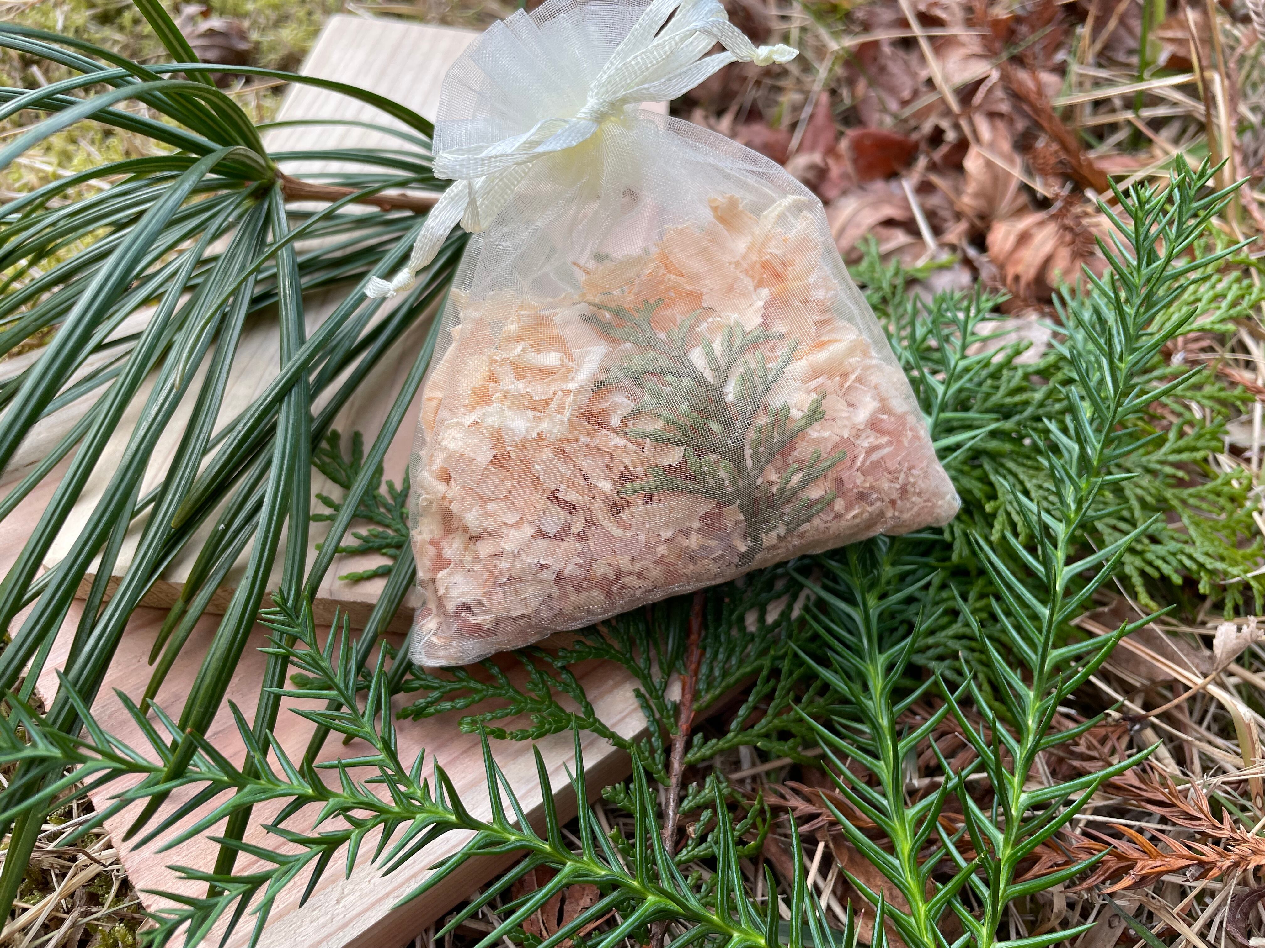 【成分】岩塩、ヒノキチップ(木部)・ヒノキ精油(木部・枝葉部)・スギ精油(木部・枝葉部)・コウヤマキ精油(木部・枝葉部)・ラベンダー精油